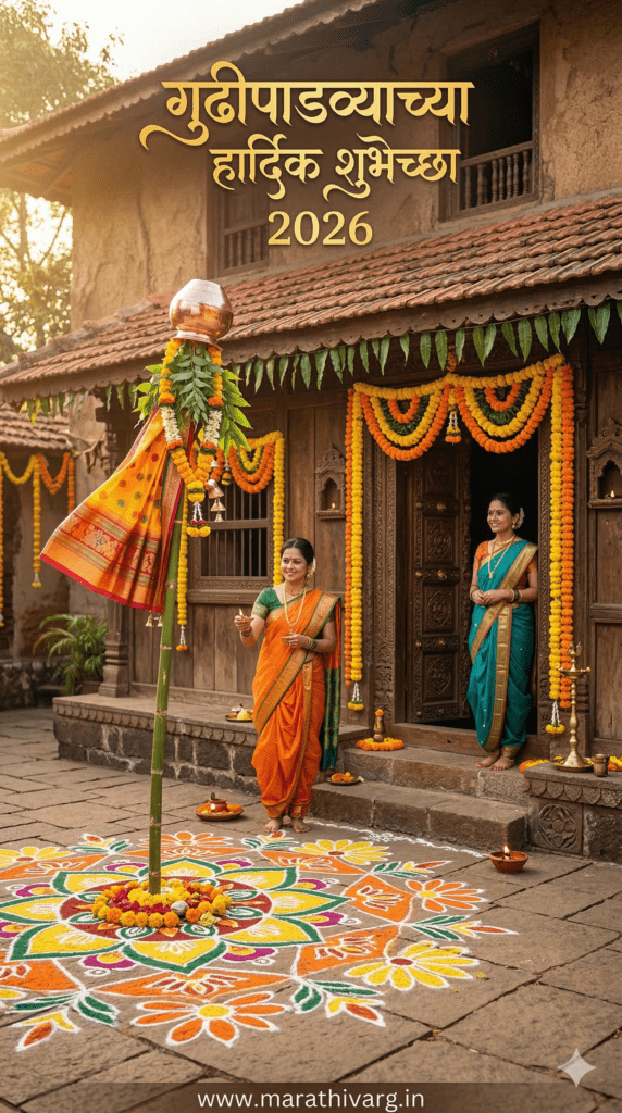 Create a beautiful Gudi Padwa festival scene in front of a traditional Maharashtrian house. A colorful Gudi with silk cloth, neem leaves and a copper kalash stands proudly near the entrance. Bright rangoli design on the ground and marigold flower decorations on the door. Warm golden morning sunlight and festive atmosphere. Add Marathi greeting text “गुढीपाडव्याच्या हार्दिक शुभेच्छा 2026”. Vertical poster style 9:16 ratio. Add website name “www.marathivarg.in” at the bottom of the image.